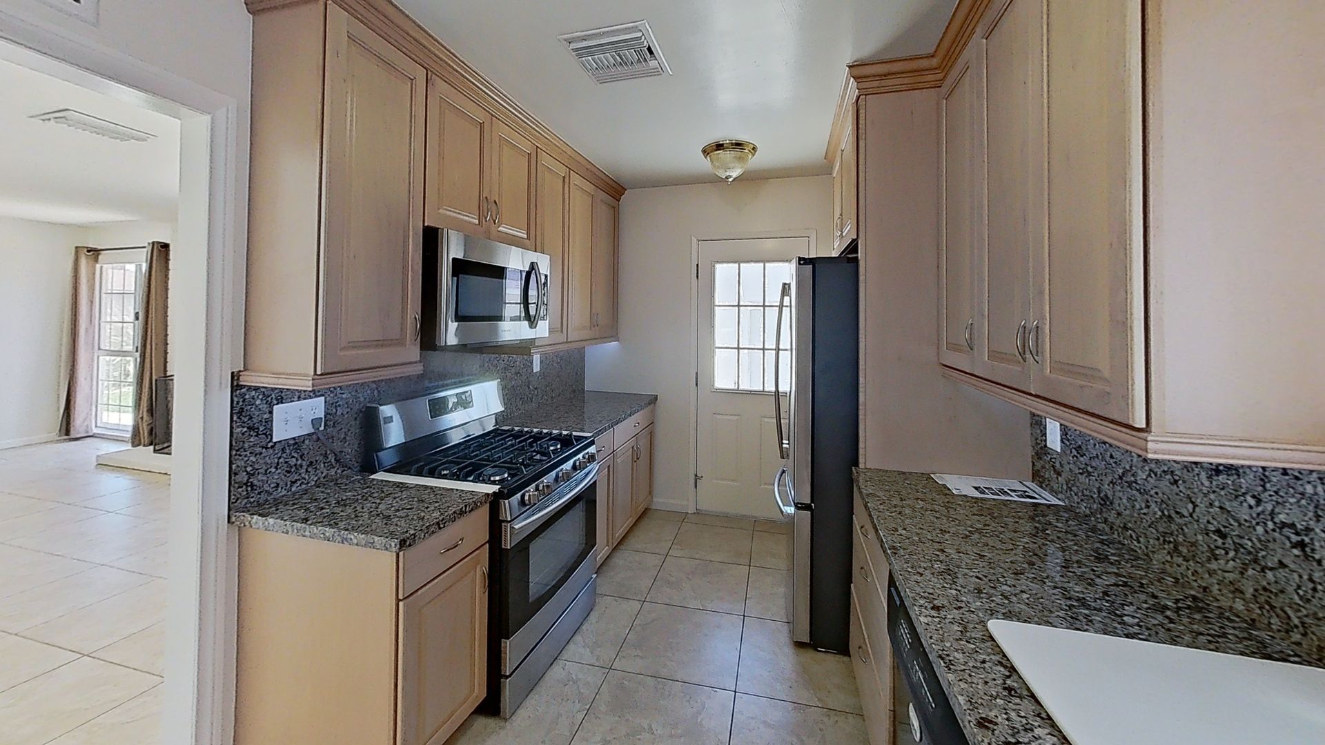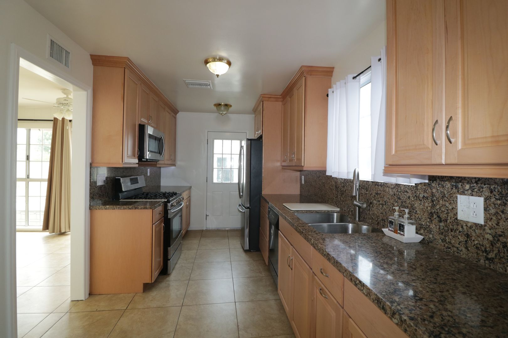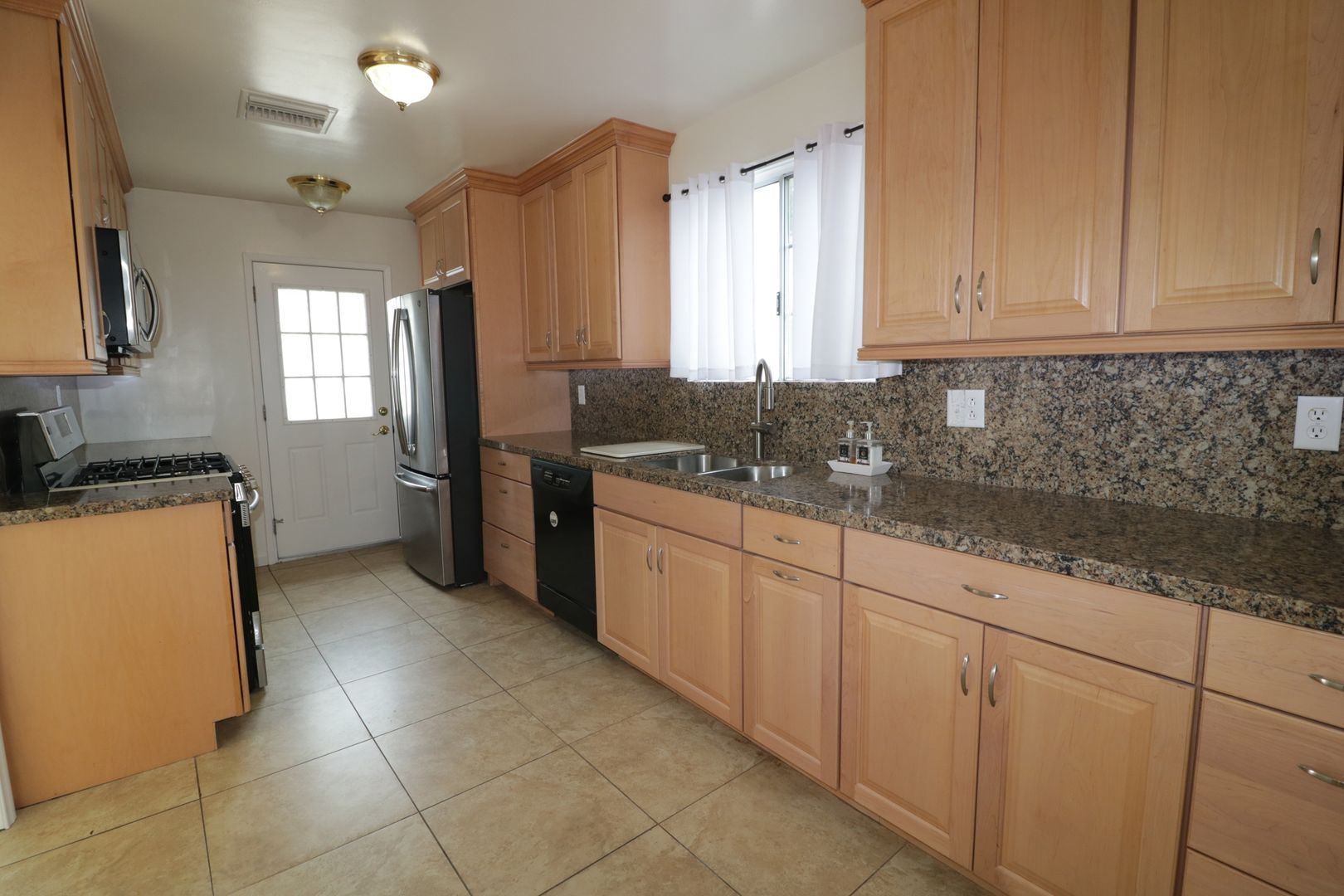 This move-in ready home in West Hills features 4/ bedrooms and 2/ baths 1,372 sq. ft. It offers a nice open living and dining area with a cozy fireplace. The remodeled kitchen includes granite counters, ample cabinets, a large walk-in pantry, and a kitchenette area. Stainless steel appliances, including a refrigerator, gas range, microwave, and dishwasher, are included. All bedrooms are well-sized, with one featuring built-in shelves suitable for an office. The home has tiled floors throughout. Property boasts a fully fenced backyard with a grassy area and a large concrete patio, perfect for entertaining. Additionally, it includes a 2-car detached garage and gated extra parking suitable for an RV or boat. It is conveniently located to near Ralph's supermarket, Topanga Mall, Fallbrook Mall, the Post Office, and West Hills Medical Center.