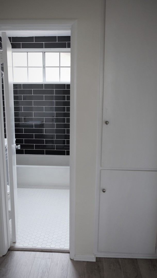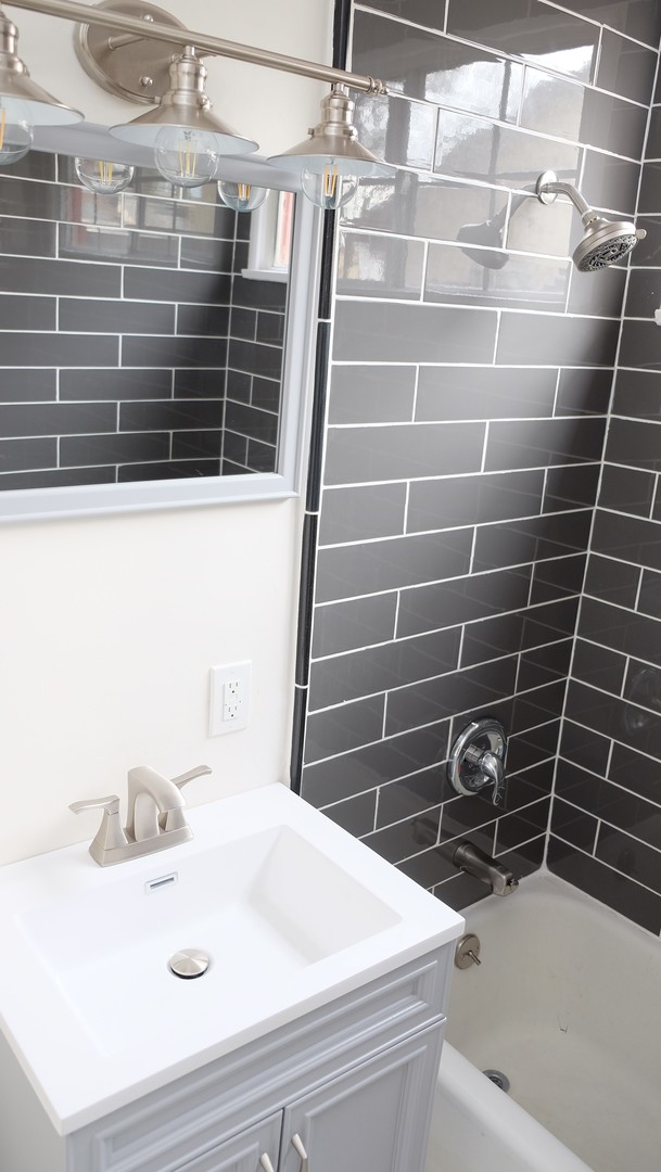 The bathroom has been renovated with a beautiful "mirror" grey tile and nickel brushed hardware. You'll also find a beautiful "floating" vanity in grey along with color matched mirror to match. Close to shopping center, schools and Freeway.