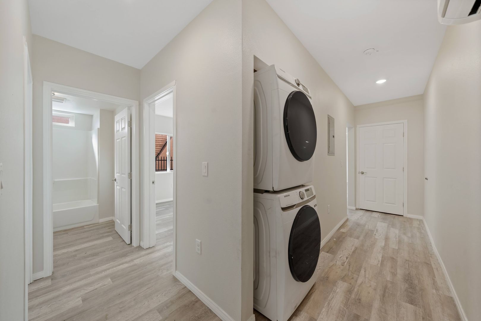 Throughout you'll find beautiful laminate flooring, contemporary bathrooms, slab counter tops, lots of closet space, dual pane windows and all appliances included (washer and dryer too).