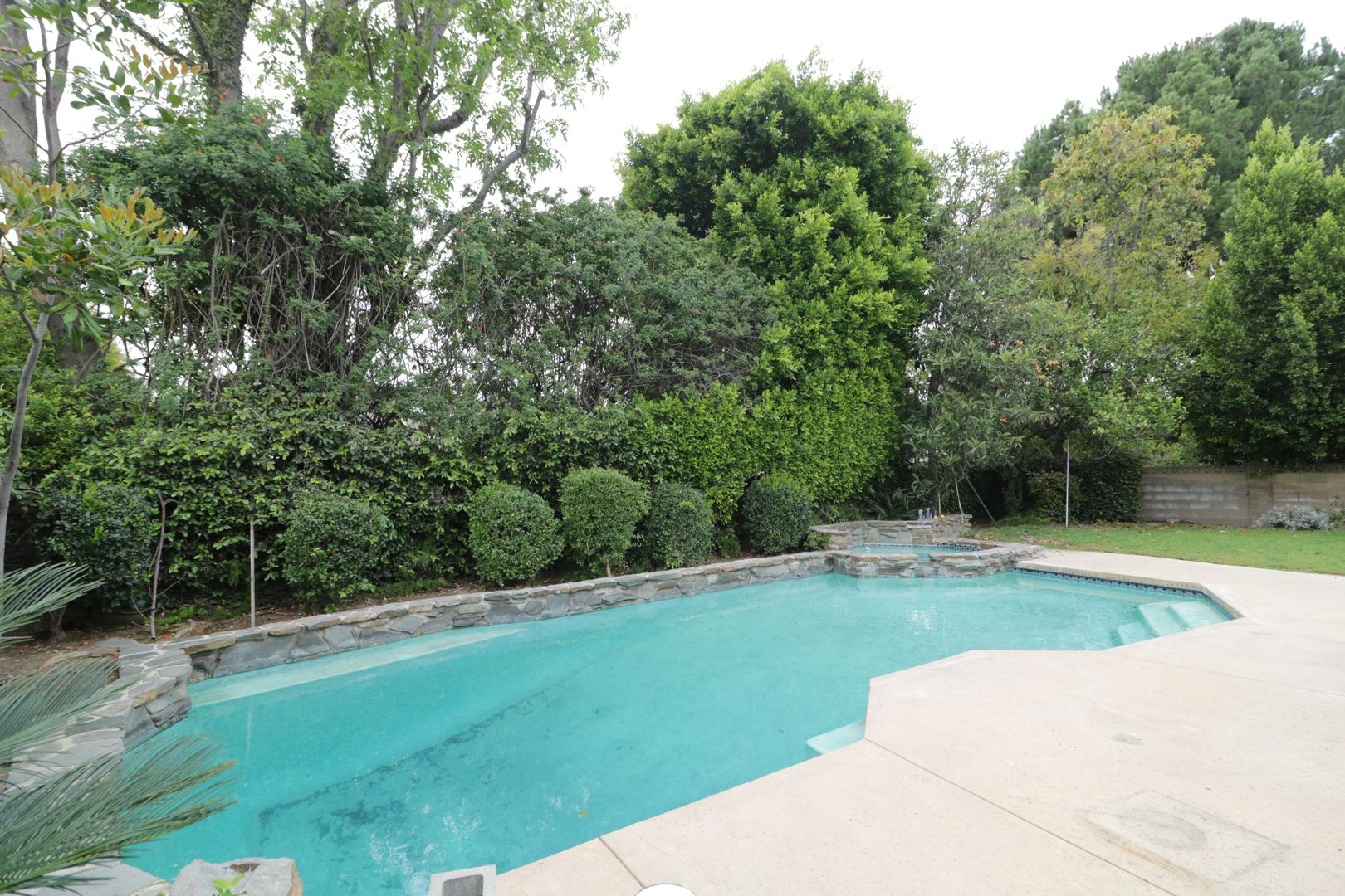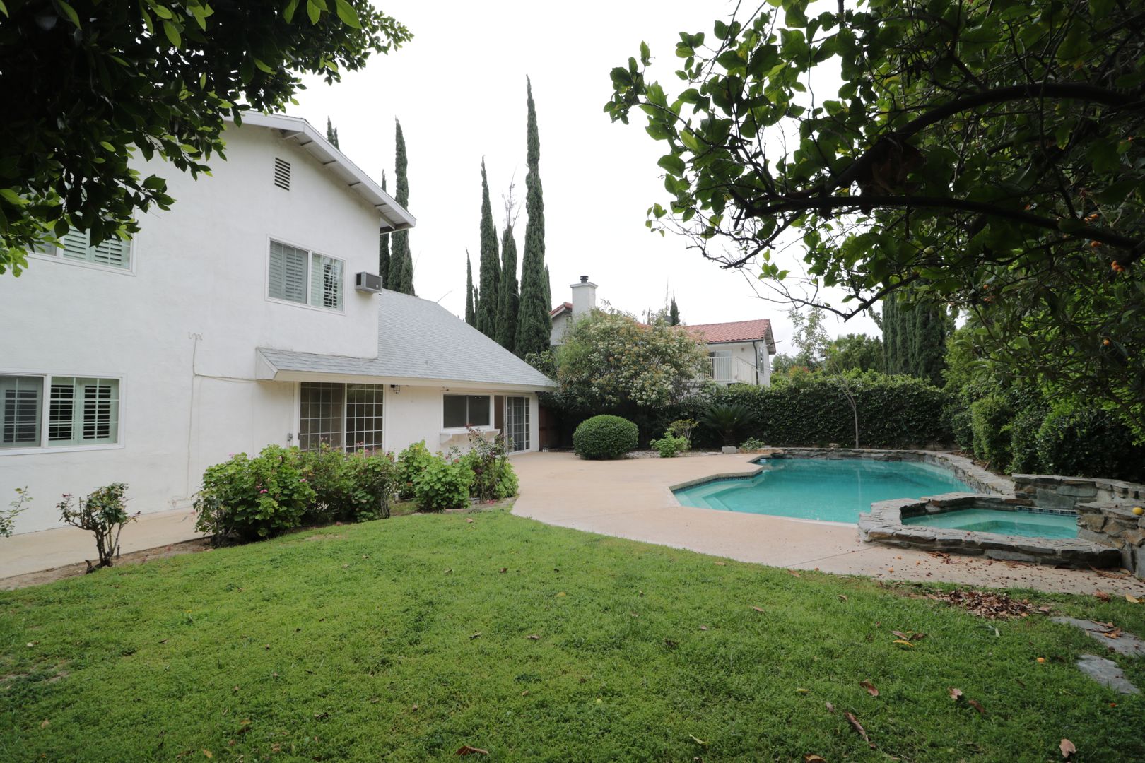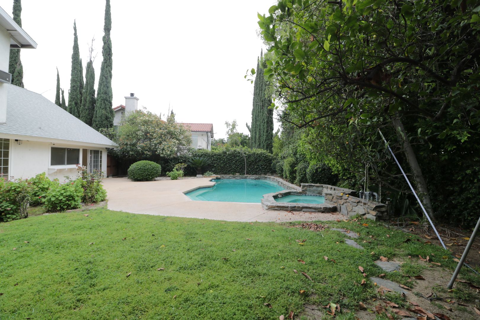 - Private backyard with mature trees. a pool, jacuzzi and grassy area.