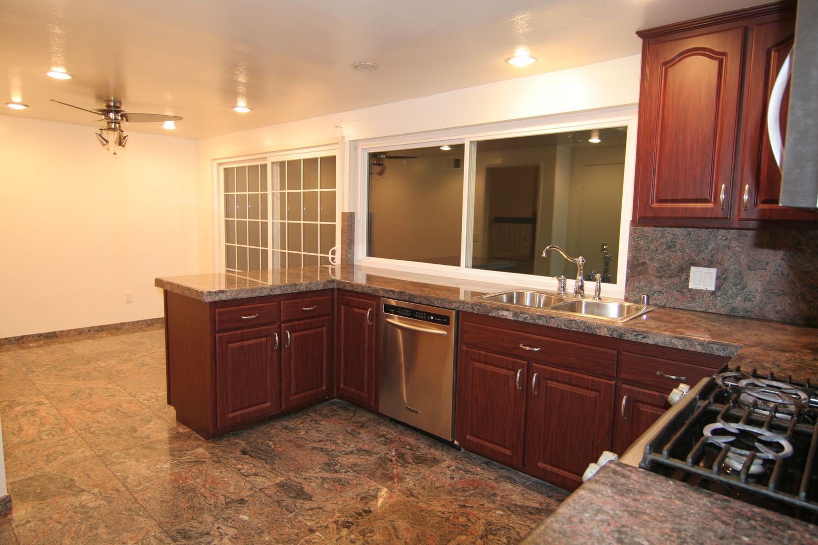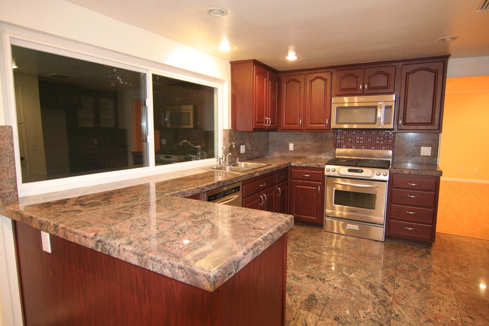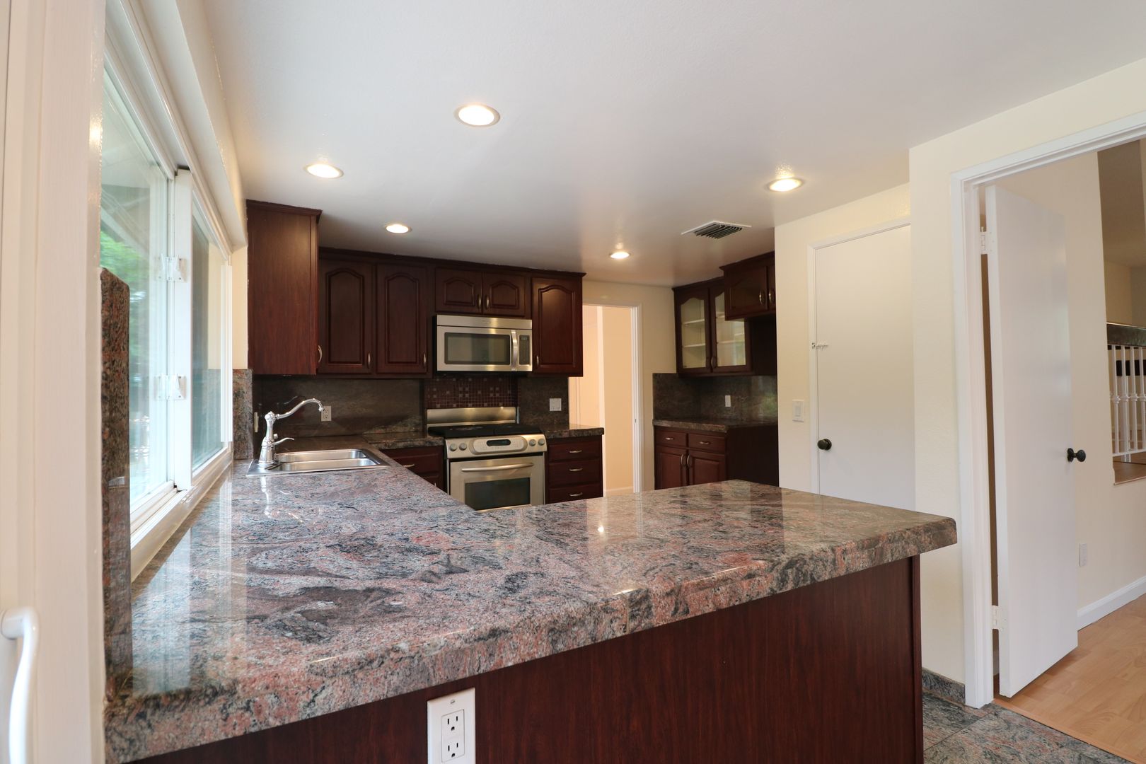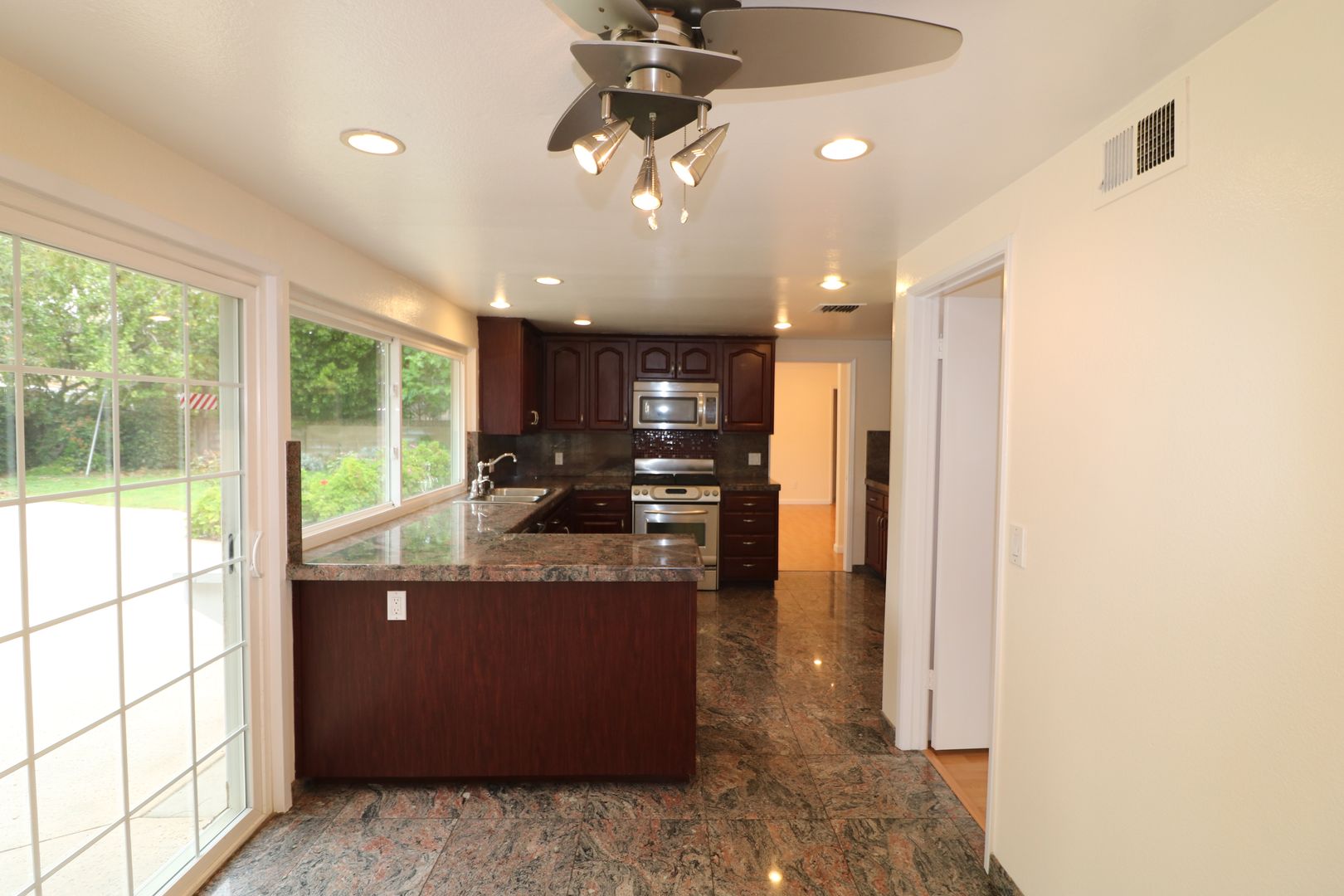 - Kitchen with granite counters, stainless steel appliances, and a breakfast room with backyard access.