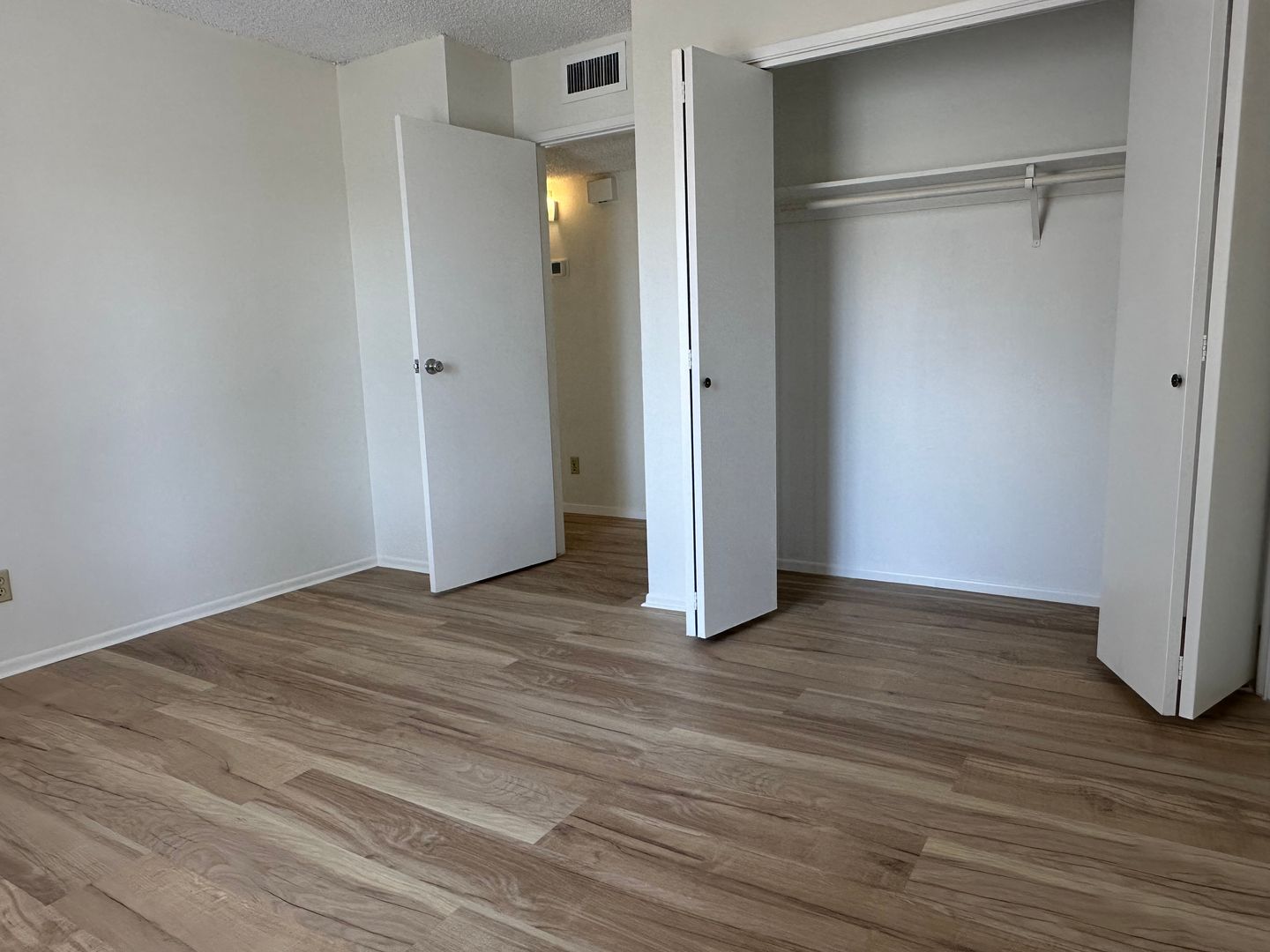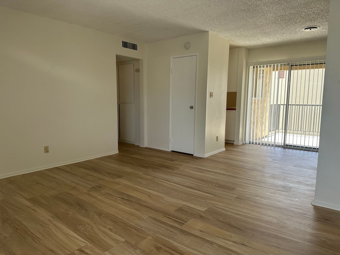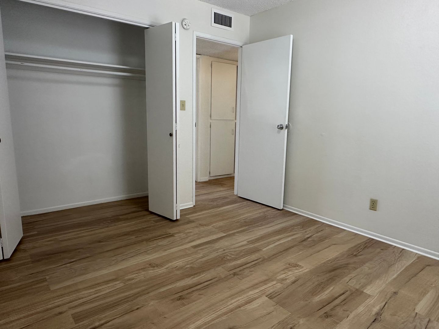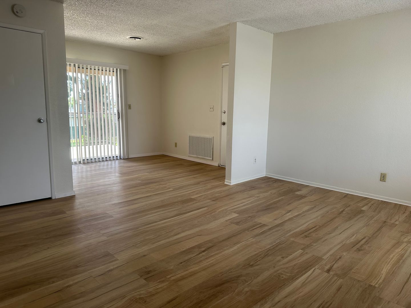 2 bedroom, 1 bath, upstairs unit READY NOW! Fresh paint and new flooring. Private balcony and central AC & heating. Refrigerator will stay for tenant use without warranty. Water & trash included. On-site laundry facility.