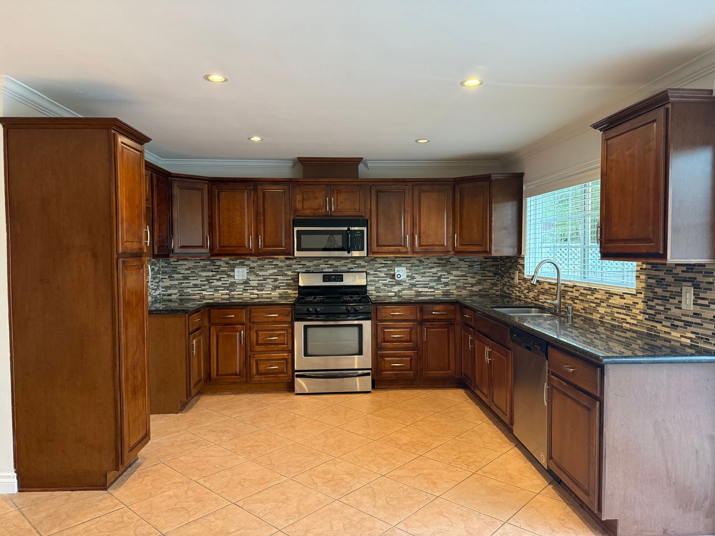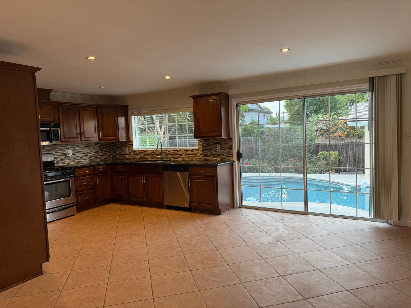 Open concept kitchen with granite countertops, cherry wood cabinets, stainless-steel appliances including built-in microwave. INCLUDES FRIDGE. Lots of kitchen cabinets and counter space. Kitchen opens up to a large space that could be a family or dining room. Sliding doors open to private backyard with a beautiful sparkling pool. Pool has new plaster and tiles.